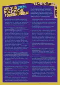 Kultur braucht Perspektive. Jetzt erst recht. Gemeinsam haben zahlreiche Kunst- und Kulturschaffende im Netzwerk #KulturMachtPotsdam konkrete Forderungen entwickelt, mit denen die Basis des kreativen Lebens in der Kulturstadt Potsdam und darüber hinaus gefestigt werden muss. Wir freuen uns auf den Dialog. politik@kulturmachtpotsdam.de